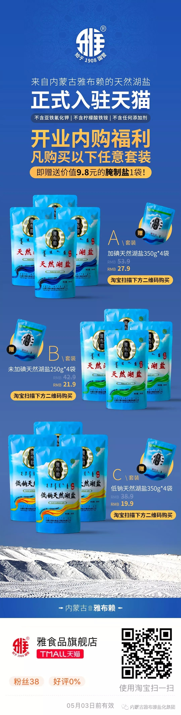 电商公司通过京东的层层严格审核,雅盐天猫旗舰店于4月1日隆重开业。自此,雅盐食用盐、洗涤盐系列8个单品全部上线销售,分别为:大青盐(320g)、低钠天然湖盐(350g)、未加碘天然湖盐(250g)、天然湖盐(350g)、腌制盐(400g)、精制盐(400g、2500g)、果蔬洗涤盐(320g)。 现在,消费者只需在淘宝输入“雅布赖盐”、“雅食品旗舰店”或使用淘宝扫描上图二维码,即可找到由米兰·(milan)中国官方网站