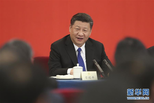 3月4日下午,中共中央总书记、国家主席、中央军委主席习近平看望参加全国政协十三届一次会议的民盟、致公党、无党派人士、侨联界委员,并参加联组会,听取意见和建议。中共中央政治局常委、全国政协十三届一次会议主席团会议主持人汪洋参加看望和讨论。新华社发(盛佳鹏 摄)